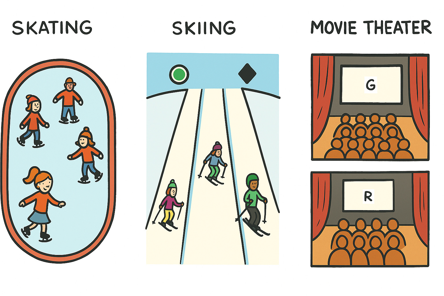 To understand the uniqueness of this, think of a skating rink. The same space accommodates any skill level all at once. The opposite of that is a ski resort where each slope accommodates a single skill level. Traveling wave pools tend to be in the middle, more like a one-room movie theater: some movies are appropriate for multiple ages but you can only play one movie at a time, so audiences for both G-rated and R-rated movies may occupy the same space only if a G-rated movie is playing, and never if an R-rated movie is playing.